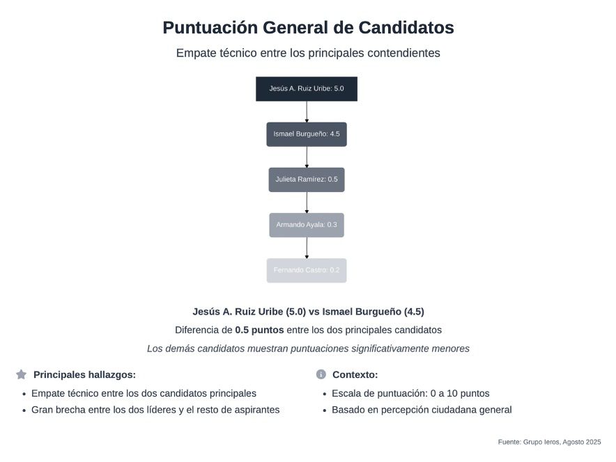 Los resultados de la encuesta CAPI realizada por Grupo Ierós entre el 15 y el 21 de agosto de 2025, con una muestra de 1,000 personas representativas de Baja California, ofrecen un panorama detallado y matizado del escenario electoral rumbo a la gubernatura del estado. La encuesta revela una competencia reñida entre los dos principales contendientes de Morena: Jesús Alejandro Ruiz Uribe, con un 5.0% de preferencia, e Ismael Burgueño Ruiz, con un 4.5%. Esta diferencia de 0.5 puntos se encuentra dentro del margen de error, lo que configura un empate técnico.