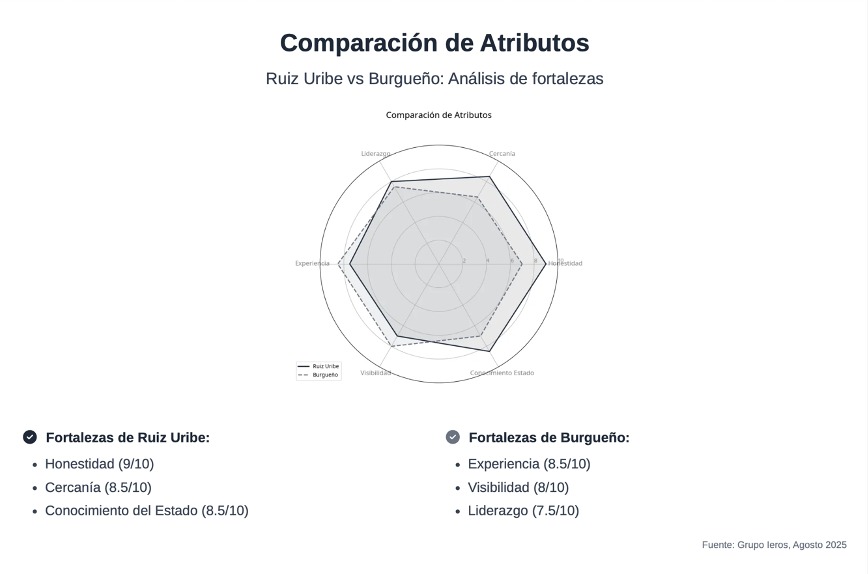 Un análisis más profundo de los datos revela diferencias clave en los perfiles de los candidatos. Jesús Alejandro Ruiz Uribe destaca por su conexión con la ciudadanía: el 65% de los encuestados lo percibe como cercano a la gente, y el 54% lo considera una opción sólida para la gubernatura, además es el único personaje con reconocimiento estatal. Sus principales fortalezas incluyen atributos intangibles de gran valor político: honestidad (9/10), cercanía ciudadana (8.5/10) y conocimiento del estado (8.5/10). Estos elementos son esenciales en un contexto donde la empatía y la credibilidad son factores determinantes para el electorado. Por su parte, Ismael Burgueño Ruiz se distingue por su experiencia al frente del municipio de Tijuana, y esto le otorga fortalezas en experiencia administrativa (8.5/10) y visibilidad pública (8/10).