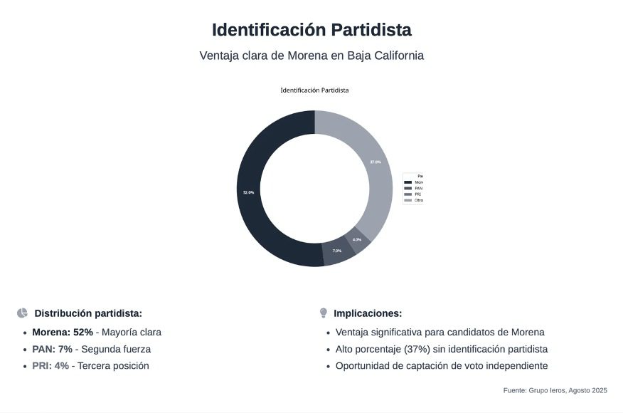 La encuesta también arroja luz sobre la identificación partidista en el estado. Morena mantiene una ventaja estructural significativa, con un 52% de apoyo ciudadano, frente al 7% del PAN y el 4% del PRI. Este dominio sugiere que la contienda por la gubernatura se definirá principalmente en la selección interna de Morena. Sin embargo, el 37% de ciudadanos sin identificación partidista representa un segmento clave que podría inclinar la balanza hacia el candidato que logre articular una propuesta convincente y transversal.