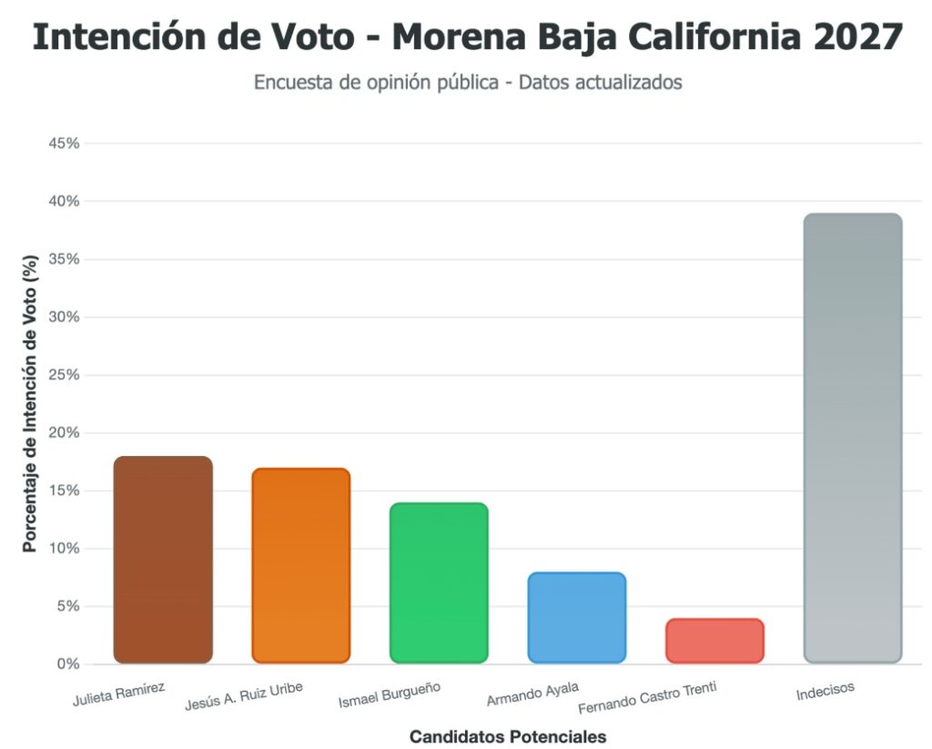 Entre alianzas incómodas, desgastes de imagen y estructuras desgastadas, la contienda interna por la candidatura de Morena a la gubernatura de Baja California rumbo a 2027 se ha convertido en un reflejo de las tensiones internas del partido y de los intereses que lo rodean. Aunque las encuestas más recientes muestran un empate técnico entre Julieta Ramírez y Jesús Alejandro Ruiz Uribe, la verdad detrás de los números va más allá de los porcentajes de intención de voto. Desde enero de este año nos hemos dado a la tarea de revisar las tendencias y, aunque nos encontramos con números inflados que desean confundir a la sociedad, las análisis de las encuenstas publicadas por medios nacionales arrojan datos relevantes.
