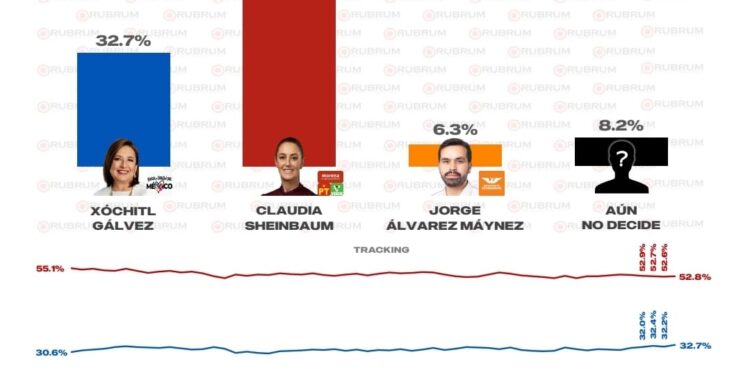 Claudia Sheinbaum reporta un 52.8 por ciento contra el 32.7 por ciento de la candidata del PRIAN; Xóchitl Gálvez lo que representa una diferencia de 20.1 puntos porcentuales, igual que Alejandro Armenta Mier en la gubernatura de Puebla, prácticamente a la mitad del periodo de campañas que culmina el próximo 29 de mayo.